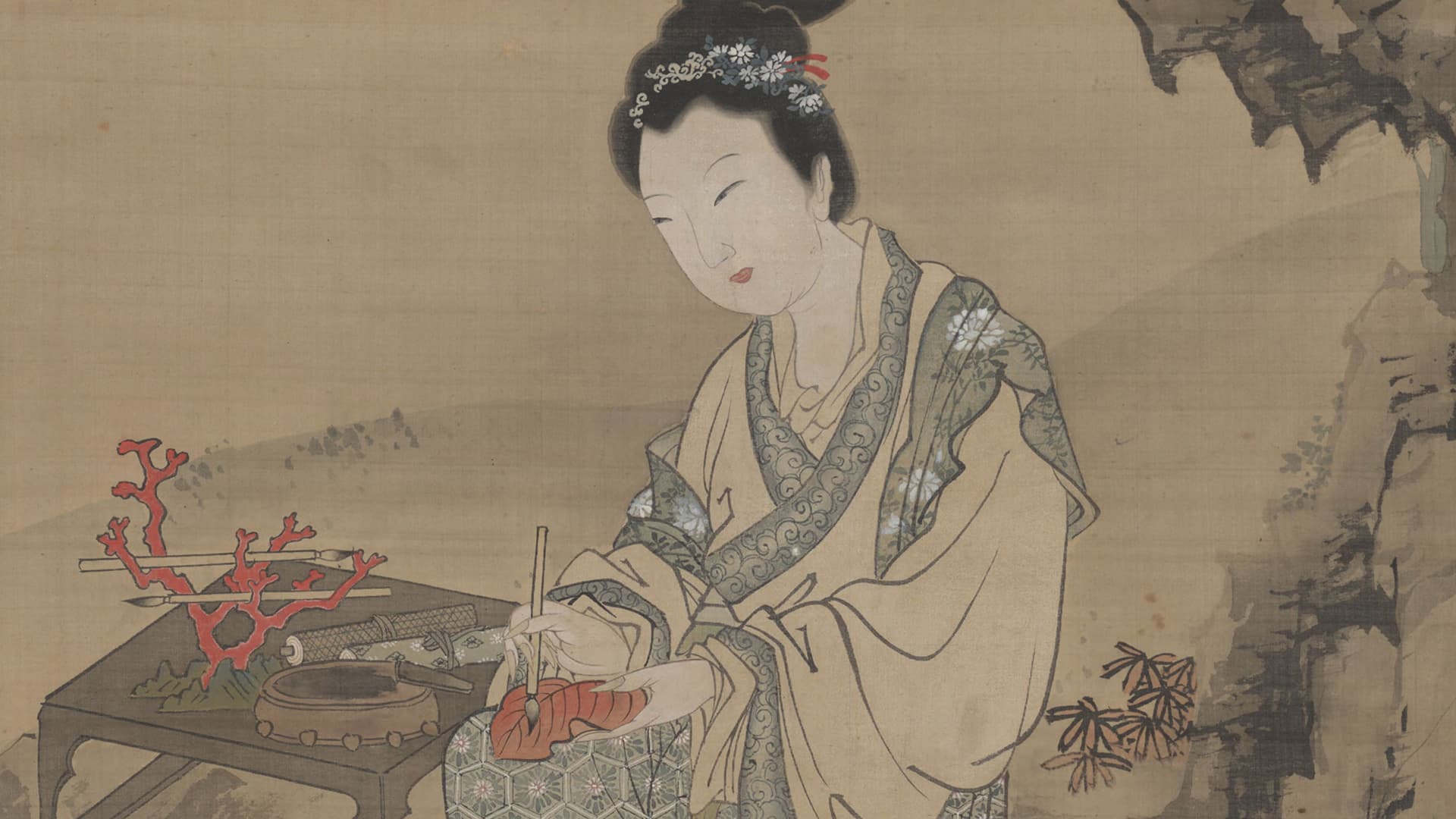 ▲ 题图 明 唐寅 红叶题诗仕女图